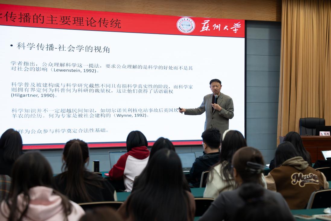 讲座伊始,贾教授以“成果斐然,理论茫然”为切入点,深入阐述科学传播的主要理论传统。他指出,从社会学的视角而言,科学传播涵盖公众参与科学、科学与媒体的关系、媒体报道的议程设置与偏见等。在传播学与心理学视角方面,包括公民科学态度及其肇因、风险感知、科学知识获取行为以及科学与行为等方面的研究。