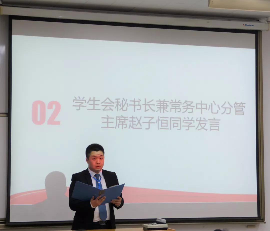 赵子恒对学生会工作提出要求。他指出学生会要以制度建设为保障,组织成体系,切实反映同学们的需求,切实为同学服务,同时要求各中心之间相互协调,各部门之间相互协调,把工作做到实处,提高工作质量。最后他表示做任何活动都要讲创新,讲品牌,加强服务以求创新。