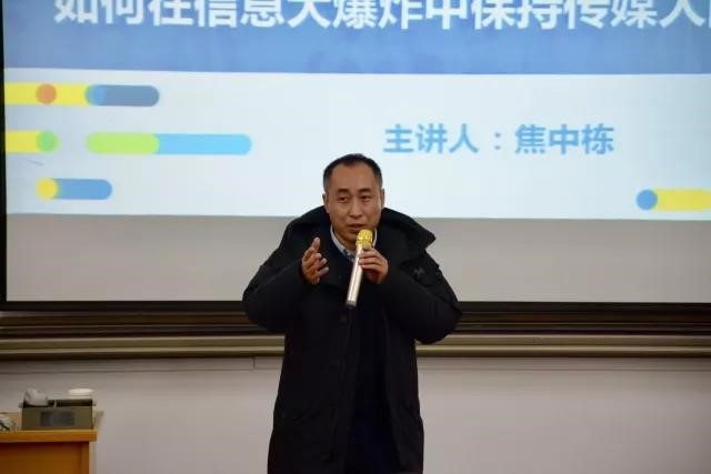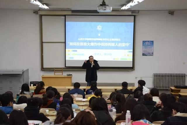 12月21日晚,山西大学新闻学院2016级本科生主题讲座于文科楼117教室成功举办。本次讲座特邀山西广播电视台公共频道副总监、中国人民大学博士后焦中栋老师作题为“如何在信息大爆炸中保持传媒人的坚守”专题讲座。新闻学院2016级全体学生参加,新闻学院16级本科生辅导员王馨誉老师出席并主持本次讲座。