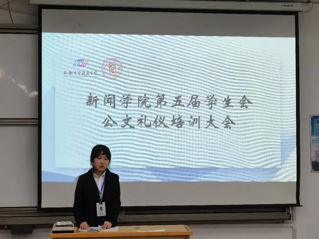 为不断提高新闻学院学生会服务能力和业务水平,展现学生会各个、成员的良好风貌,新闻学院学生会于11月20日晚19:30开展了第五届学生会公文礼仪培训大会,新闻学院学生会特邀校学生会综合事务部骨干朱思启同学、信息宣传部骨干李欣倍同学出席大会并进行培训。本次大会由新闻学院学生会秘书处部长谭歌主持。