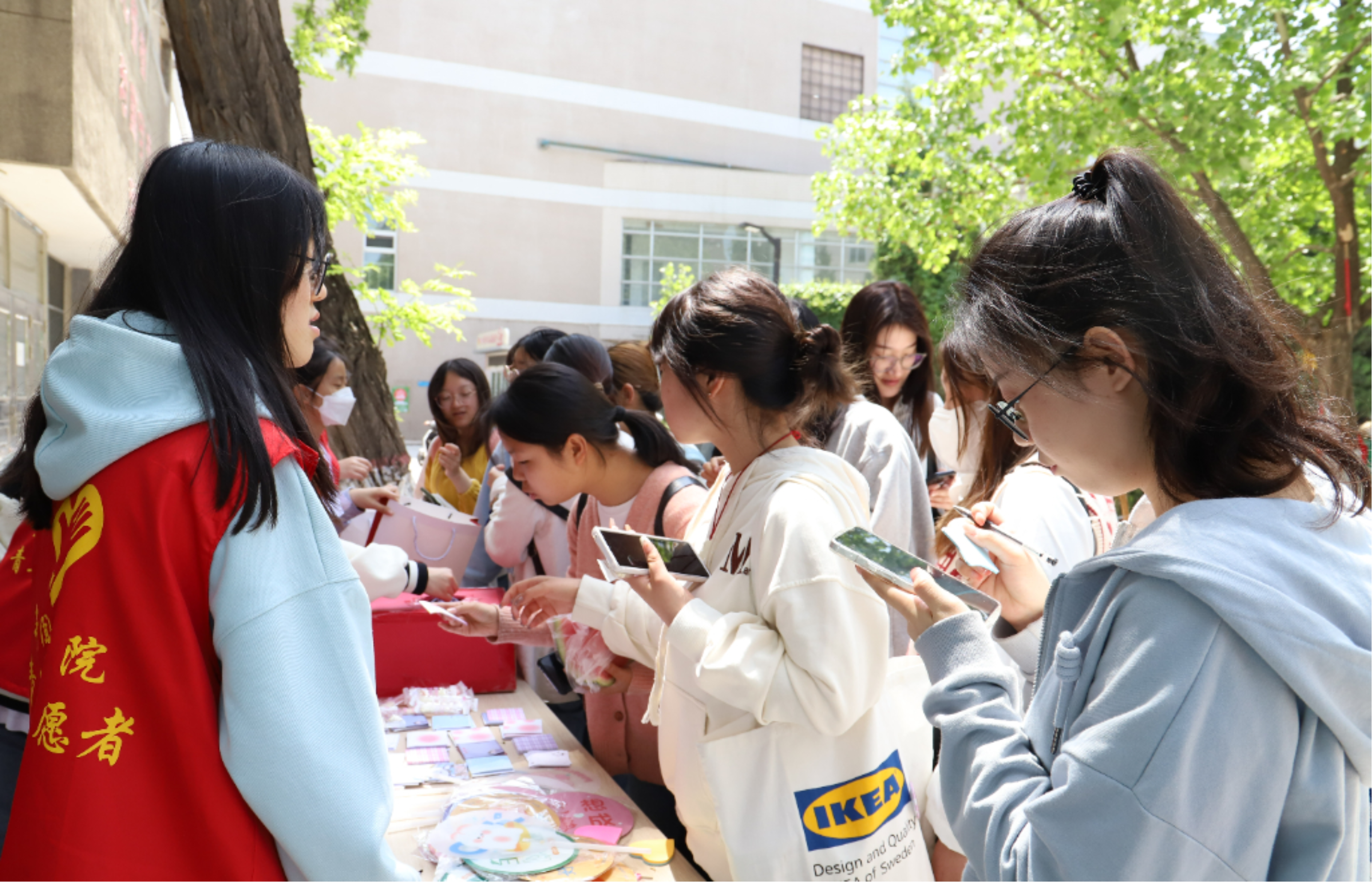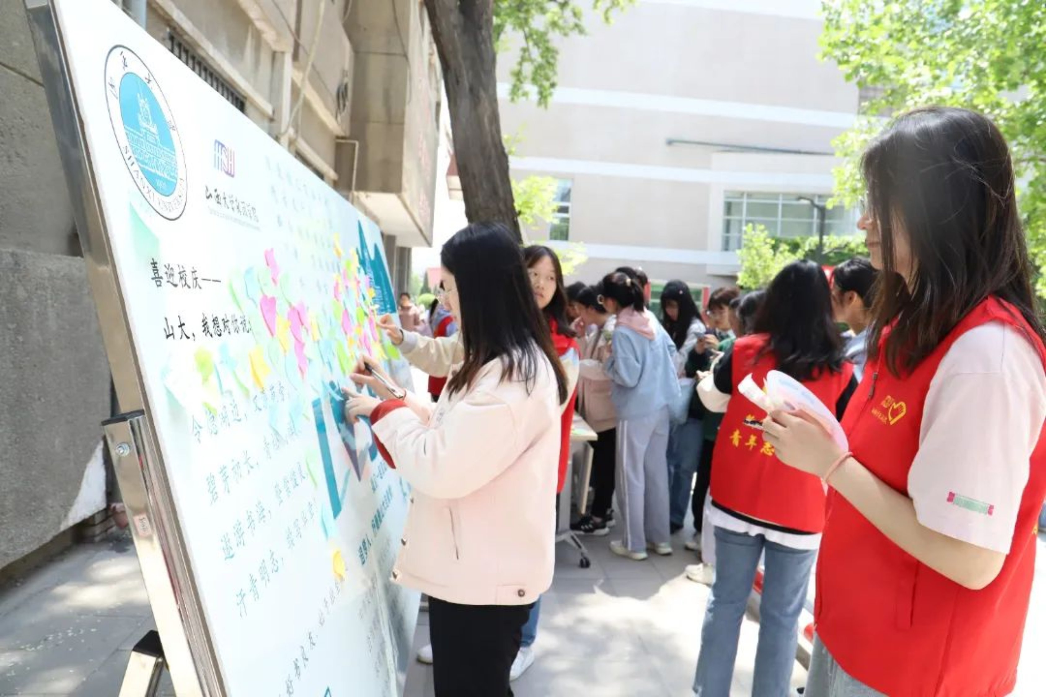 本次活动于令德、文瀛餐厅门口开展。活动伊始,同学们便被精致的展板吸引,踊跃地参与其中。在志愿者的引导下,同学们纷纷拿起笔,借助便利贴表达自己对学校最真挚的祝福。此外,本次活动还设有校史知识有奖问答环节,同学们也都积极参与,对校史有了进一步的了解与感悟。整个活动过程中,志愿者们各司其职,积极宣传,活动有条不紊地进行着,现场一派热闹景象。
