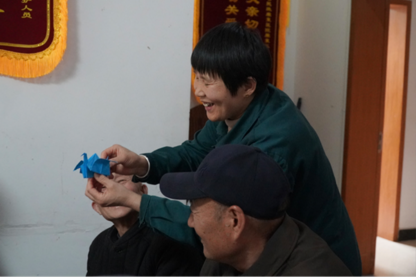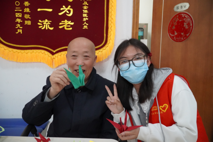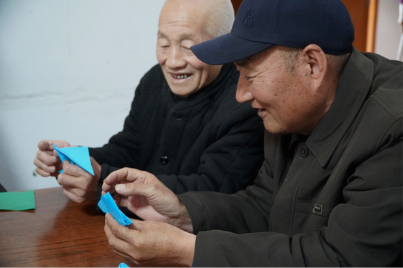 而后,志愿者们拿出提前准备的彩纸,与老人们一起动手折纸。手工制作让老人们尽享动手之乐,也让志愿者们沉浸在与老人相处的乐趣之中。